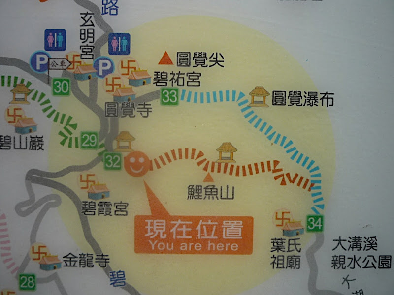 如下圖,當時從大溝溪親水公園出發,走鯉魚山到這裡(32),隨後右轉圓覺寺、經過圓覺瀑布再回到出發點。這次搭車重返此地(32),改走另一邊碧山巖階梯(29)到達碧山巖。