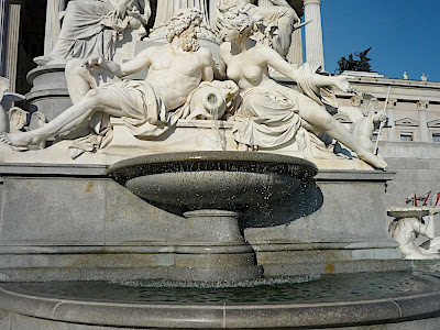 主角是雅典娜女神,背景是國會大廈屋簷雕飾。而女神雕塑本身高達四公尺多,中層是四個動作各異的人像,下層則有四個出水口,前後左右各一個。
