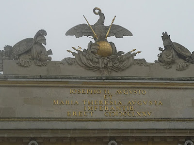 門頂的標語可以看到熟悉的名字,IOSEPHO II(約瑟夫二世) 和 MARIA THERESIA(瑪利亞泰瑞莎),瑪利亞泰瑞莎是十八世紀歐洲奧匈帝國黃金時代的著名女皇,在位期間,藝術方面,奠定了維也納黃金古典音樂的輝煌時代,外交方面,利用聯姻和各國皇室保持友誼,而約瑟夫二世則是瑪利亞泰瑞莎的長子,也是繼承女皇的下一任國王。