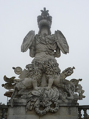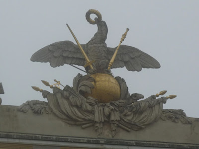 大殿屋頂的老鷹,兩腳抓著權仗和寶劍,坐在金球上面,下面壓著一堆捲起來的旗幟。我好奇的是,為什麼不是用象徵哈布斯堡家族的「雙鷹」呢?