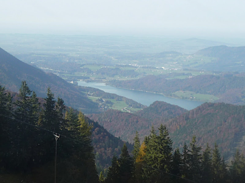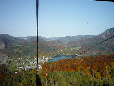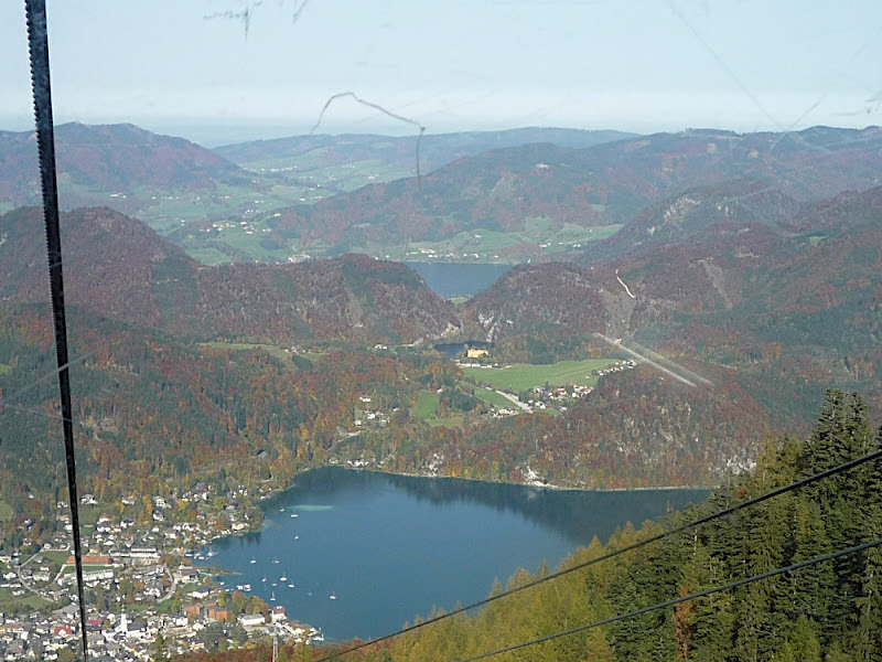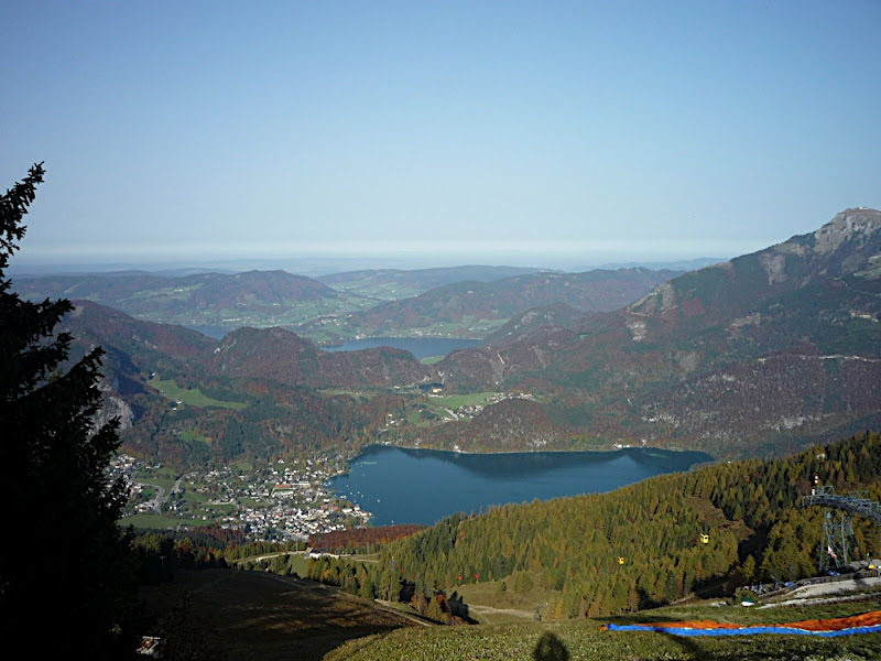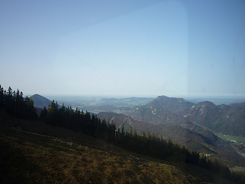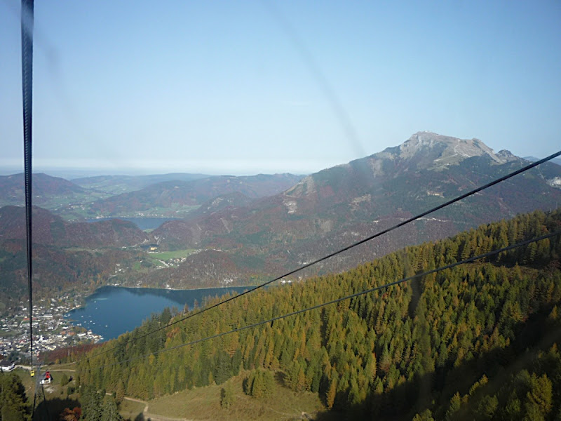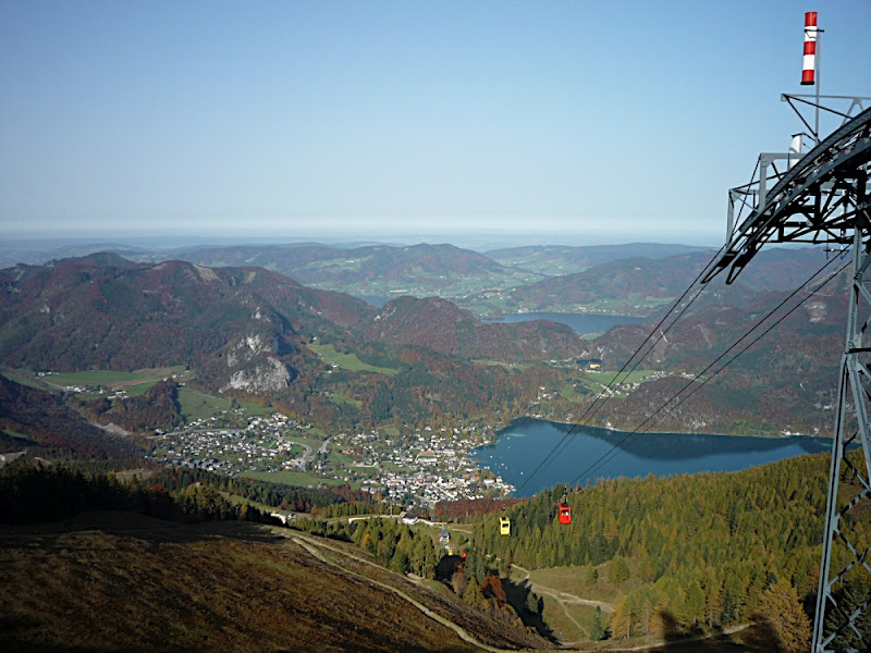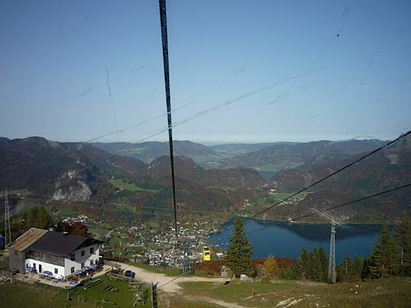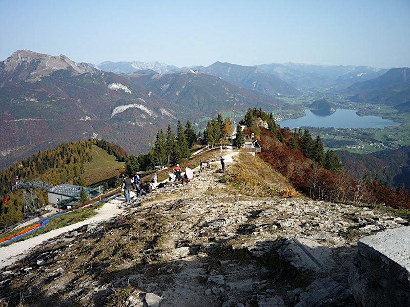 站在上面,放眼望向四周,天公做美,有藍藍的天、藍藍的湖水、一大片秋紅深綠夾雜的森林、連綿的山脈,太陽很大卻不熱,這裡就是奧地利有名的湖區景色。看看時間,也差不多該離開了,錯過了最後一班車就『走』下山吧!