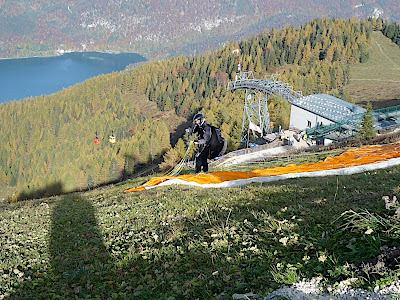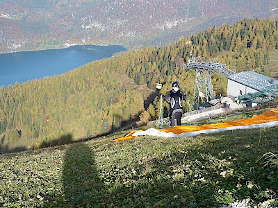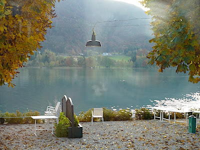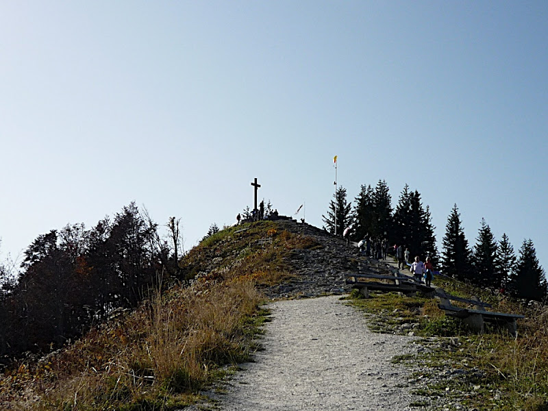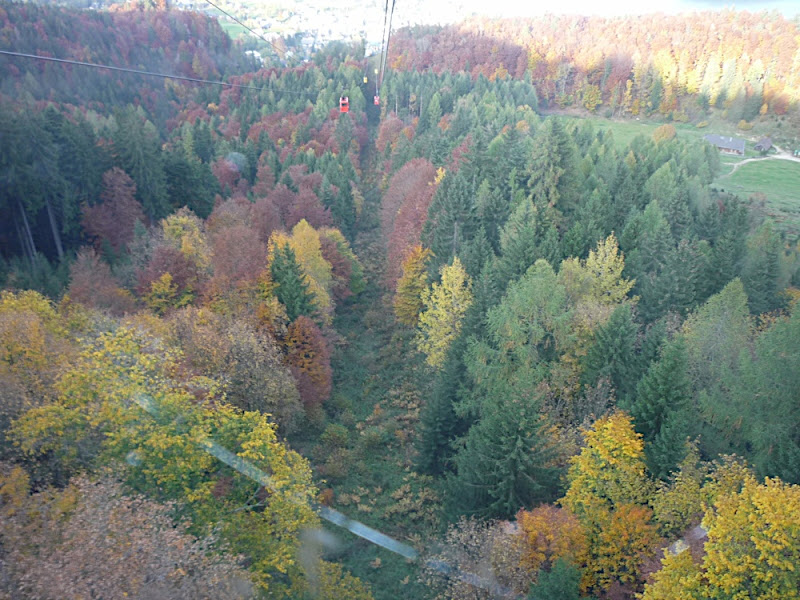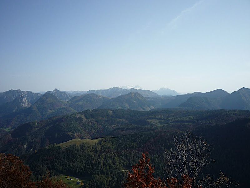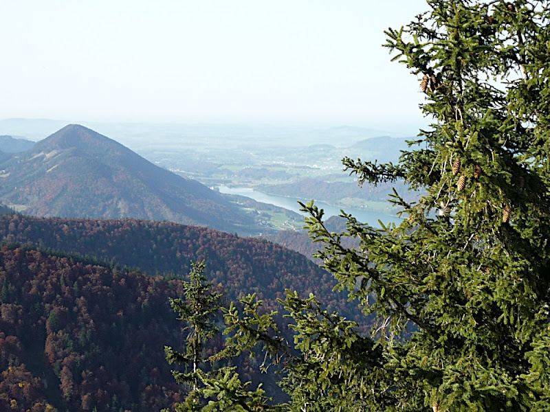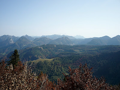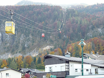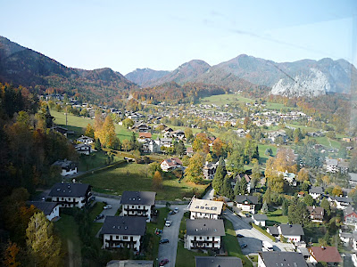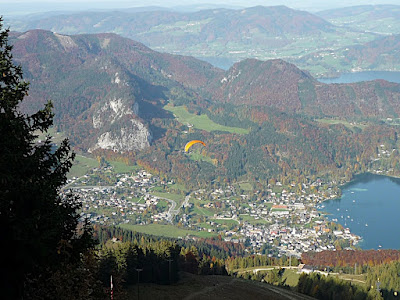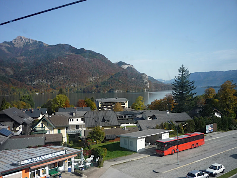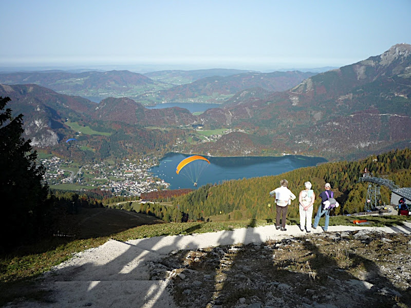 站在上面,放眼望向四周,天公做美,有藍藍的天、藍藍的湖水、一大片秋紅深綠夾雜的森林、連綿的山脈,太陽很大卻不熱,這裡就是奧地利有名的湖區景色。看看時間,也差不多該離開了,錯過了最後一班車就『走』下山吧!